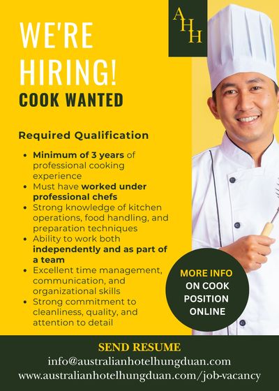 The Australian Hotel and Restaurant is currently hiring a skilled and dependable Cook to join our team. We are looking for someone with a strong culinary background, who has worked under professional chefs, and is capable of maintaining high standards in food preparation, hygiene, and kitchen operations.
